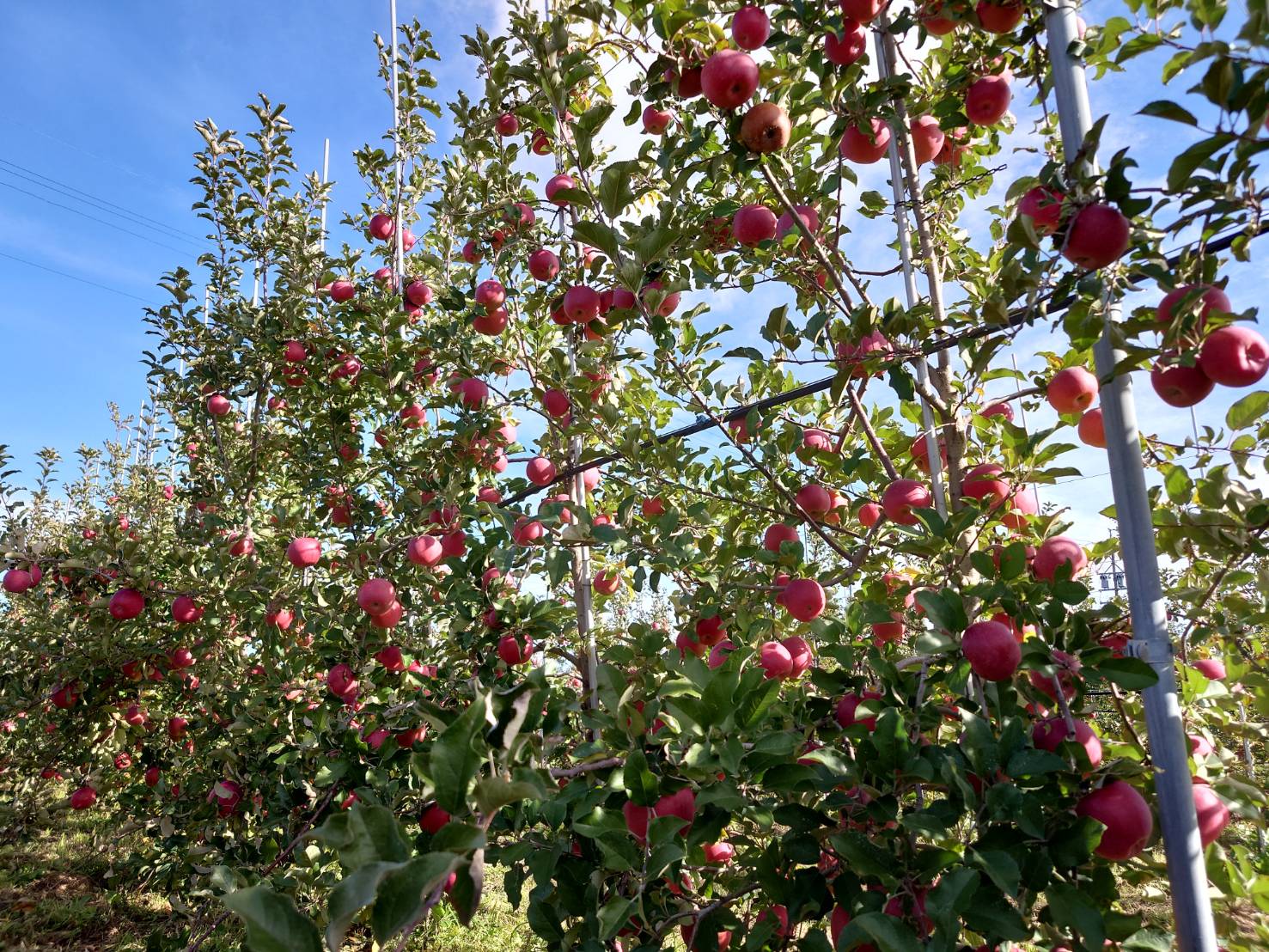 10月にオープンした直売所では、11月10日からりんご狩りもスタートしました。もぎたての美味しいりんごをその場で味わうことができ、子どもたちにはぜひ畑の空気を感じてほしいという思いから、時間無制限・レジャーシート持込OKのスタイルにしています。お昼ご飯を食べながらゆっくり田舎の時間を感じてください。りんご狩りをする園地は熊の出ない下の方なので、安心してお越しくださいね。笑